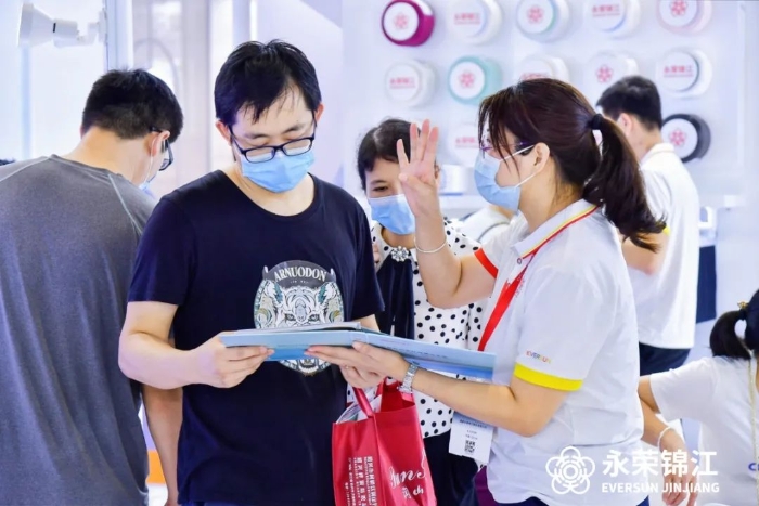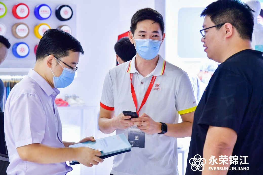 展位内的荣誉墙上刻画着企业的历史。永荣锦江创建于2006年,坐落于中国著名的纺织城和侨乡福州市长乐区,先后荣获“亚洲品牌500强”、“中国驰名商标”、“国家火炬计划重点高新技术企业”、“福建省首批50家创百亿企业”、“福建省百家重点工业企业”等荣誉。同时还多次荣登福建省“制造业单项冠军企业”名录,成为全国单项冠军示范企业。