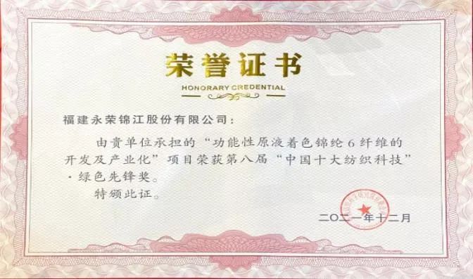 12月29日,在泉州晋江召开的“2021中国纺织科技成果对接峰会暨第八届‘中国十大纺织科技’发布会”上,永荣锦江负责承担的“功能性原液着色锦纶6纤维的开发及产业化”项目荣获“中国十大纺织科技·绿色先锋奖”。据悉,这是永荣锦江连续第二次荣获中国十大纺织科技奖项。