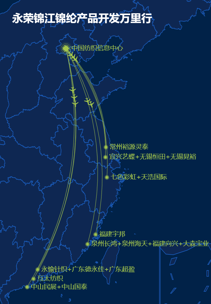 9月14日和11月15 — 25日,中心技术团队与永荣锦江的技术服务、市场推广和营销负责人共同组成联盟工作组开展“2021年度永荣锦江锦纶产品开发万里行”活动。联盟工作组由国家纺织产品开发中心总工程师陈宝建带队,从首站福建到浙江、广东、江苏等地跨越4省9市,走访了17家主营内衣、瑜伽服、运动服等品类的企业。