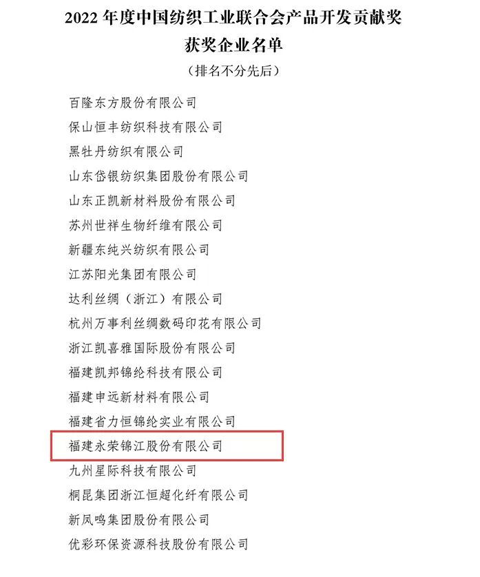12月27日,中国纺织工业联合会向社会公布了2022年度中国纺织工业联合会产品开发贡献奖评审结果。最终,经中国纺织工业联合会产品开发贡献奖评委会对申报企业(单位)的资格审查、专家初评和终评,决定授予福建永荣锦江股份有限公司等66家企业2022年度“中国纺织工业联合会产品开发贡献奖”荣誉称号。此次我司再续辉煌,充分展示了其作为锦纶行业龙头企业的稳固地位和卓越风采。