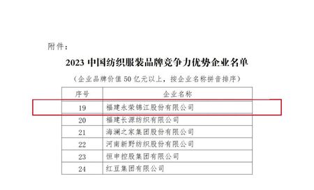 近日,中国纺织工业联合会发布了“2023年中国纺织服装品牌竞争力优势企业”榜单,福建永荣锦江股份有限公司强势入选。据了解,本次评选由中国纺织工业联合会主办,以相关国际及国家标准为基础参照,包含企业品牌影响力、产品创新能力、市场竞争力、社会形象等综合标准,历经多个阶段严格评选而得出的结果。