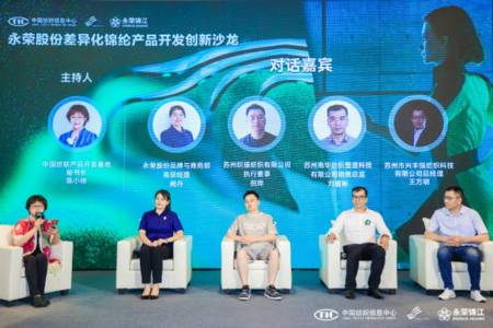 在对话论坛中,主持人陈小丽与福建永荣锦江股份有限公司品牌与商务部高级经理阙丹、苏州织璟纺织有限公司执行董事倪晔、苏州南华纺织整理科技有限公司销售总监刘盛彬、苏州市兴丰强纺织科技有限公司总经理王方明,围绕“构建锦纶上下游共赢产业链”主题展开了探讨交流。