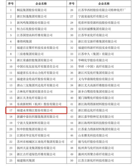 据悉,此次排名依据企业填报的2022年1-12月数据,共22个名单,包括化学纤维总产量排名,以及包括锦纶民用长丝等在内的21个细分品类。根据排名显示,2022年中国化学纤维产量综合排名中,永荣股份进入前20强行列,位列第17位,名次较去年上升三位;2022年中国锦纶民用长丝产量排名中,永荣股份位居第一。这已经是永荣股份连续五年蝉联中国锦纶民用长丝产量排名第一了,这再次展示了其作为中国民用尼龙纤维行业龙头企业的地位和风采。作为一家集化工、化纤及新材料为一体的大型高新技术企业,公司拥有福建永荣科技有限公司、福建景丰科技有限公司、福建新创锦纶实业有限公司、福建锦逸高性能材料有限公司等多家实体企业,已打通从“苯——己内酰胺——尼龙切片——尼龙纤维”的上下游产业链,且各工序拥有世界高精尖设备,己内酰胺采用全球先进的艾默生数字智能生产控制系统,聚合采用德国鲁奇及瑞士伊文达最先进PA6聚合设备,纺丝采用德国巴马格最先进WINGS24头牵伸卷绕一体化技术纺丝设备和EAFK384全自动落筒加弹机。作为中国锦纶化纤行业的领头企业,一直以来,永荣股份始终践行“科创多彩幸福生活”的企业使命,围绕锦纶主业,不断加大研发投入,围绕“终端化、一体化、科创化、数智化、全球化”的企业发展战略,承担起“安全、绿色、奉献”的企业社会责任。