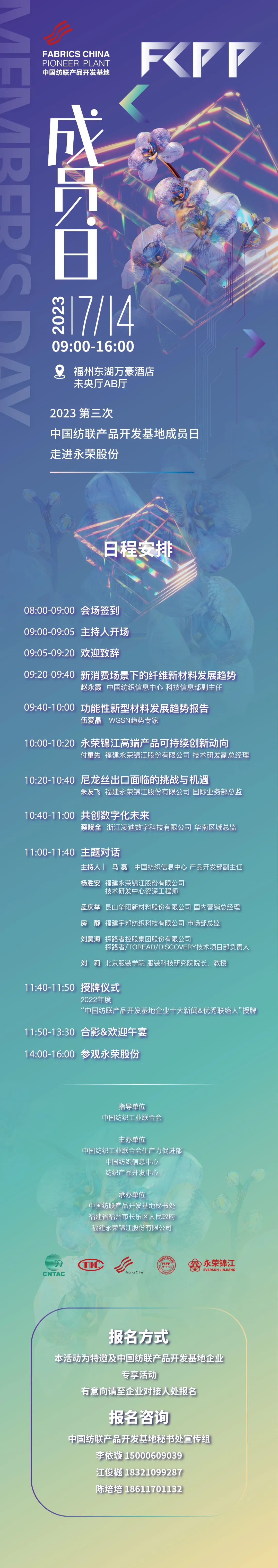 为更好地推进纺织行业产品开发协同创新工作,激发产业链上下游集成创新活力,发挥中国纺联产品开发基地企业平台价值,打造“Fabrics China中国流行面料”系统工程品牌影响力,中国纺联产品开发基地秘书处定于2023年7月14日在福建省福州市长乐区召开“2023年第三次中国纺联产品开发基地成员日——走进永荣股份”活动。