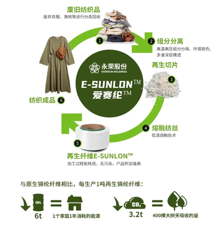 E-SUNLON? disrupts traditional fiber raw material sources, forming a "green closed loop" from waste textiles - post-consumer recycled slices - post-consumer recycled fibers - textile finished products. Currently, E-SUNLON? has received GRS certification, EPD Environmental Product Declaration certification and LCA life Cycle assessment for global recycling specifications.