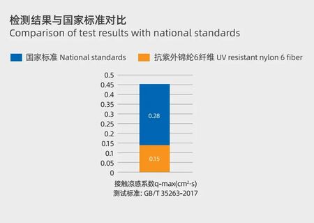除了防晒性能,在燥热的夏日,透气和凉感也是考量一件防晒衣舒适性的不可或缺的因素。永荣股份抗紫外纤维在实现防晒的同时可根据客户需求赋加凉感、吸湿排汗、抗菌等功能。在炎炎夏日,让消费者实现防晒清爽两不误。根据GB/T35263-2017标准,抗紫外纤维接触凉感系数q-max(cm2s)远超过国标 0.15cm2s,明显优于普通锦纶。