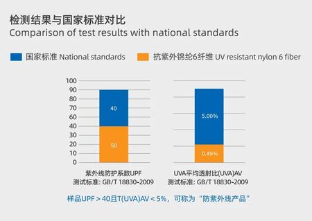 防晒性能是防晒服消费者首要关注的因素,永荣股份抗紫外纤维通过加入无机粉体,从原纱层面实现防紫外效果,并且多次水洗防晒不减。改变了传统防晒衣通过添加涂层、染色助剂等实现防晒的方式,其对紫外线的隔离作用也实现了阶级的跨越。根据光学原理,透射率+反射率+吸收率=100%,因此,紫外线的反射率和吸收率越高,透过率就越低,织成的纺织品防晒效果就越好,从而阻挡紫外线穿过纺织品伤害人体皮肤。我司抗紫外包括遮蔽型抗紫外锦纶6纤维、吸收型抗紫外锦纶6纤维,以及遮蔽+吸收叠加的增强型抗紫外锦纶6纤维,同时可结合下游客户需求进行产品定制。根据GB/T18830-2009标准,抗紫外锦纶6纤维可实现UPF>50,晒黑杀手锏UVA透过率小至0.49%,远优于国家标准。