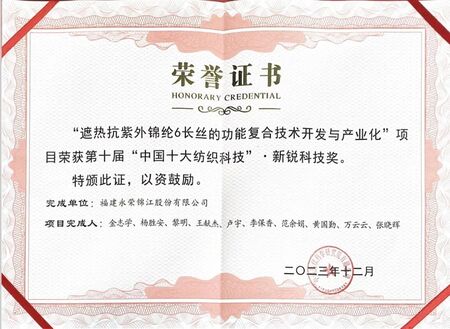12月22日,在福建晋江举办的2023中国纺织科技成果对接峰会暨第十届“中国十大纺织科技”发布会上,永荣股份申报的“遮热抗紫外锦纶6长丝的功能复合技术开发与产业化”项目以及“阳离子锦纶6长丝的开发及产业化”项目分别荣获“中国十大纺织科技·新锐科技奖”和“中国十大纺织科技·绿色先锋奖”两大奖项。据悉,永荣股份已连续四次荣获中国十大纺织科技奖项,充分展现了我司用科技力量引领纺织服装行业高质量发展的实力。