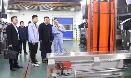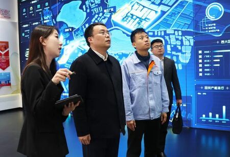 在黄剑的陪同下,孙以东一行参观了永荣股份数字展厅及锦江纺丝五部智能制造生产车间,详细了解永荣发展历程、产业链上下游布局情况、产品研发应用、数字化转型等情况,现场了解到了永荣股份在锦纶业界内实现从“CPL输入、切片生产、切片输送、纺丝生产、产品检验、包装、入库、出库”全流程自动智能化;近距离观摩了锦纶业内首家规模化、产业化投产的柔性多头(24头wingsFDY)生产车间、自动落筒、智能立体仓库等一体化生产。