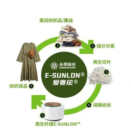 永荣股份主动承担纺织行业可持续发展的重任,开创了废旧纺织品回收再利用的先河,研发出消费后再生纤维产品。经过坚持不懈的努力和试验,首次攻克了国内技术壁垒,通过物理化学法将废旧纺织品回收再造。在此处理过程中不添加任何化学试剂,在环境可持续发展方面作出了重大贡献。