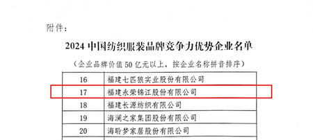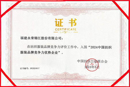 5月12日,第八届中国品牌日活动期间,以“品牌新质 未来新光”为主题的2024中国品牌发展大会纺织服装行业会议在上海举行。会上发布了“2024中国纺织服装品牌竞争力优势企业”名单,福建永荣锦江股份有限公司强势入选。