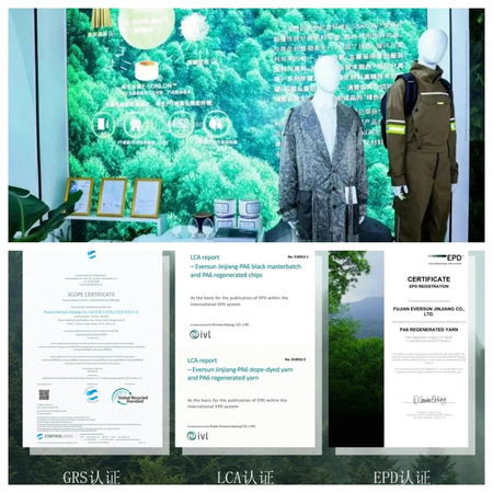 目前,永荣股份再生锦纶和爱赛纶均取得全球回收利用规范 GRS认证;黑色母粒、再生切片、原液着色纤维、再生纤维已通过“从摇篮到坟墓”生命周期评价(LCA认证);再生切片及再生纤维通过EPD环境产品声明认证。
