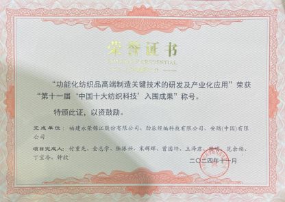 11月18日,在福建泉州晋江召开的2024中国纺织科技成果对接峰会暨第十一届“中国十大纺织科技”发布会上,永荣股份与劲派经编科技有限公司、安踏(中国)有限公司联合申报的“功能化纺织品高端制造关键技术的研发及产业化应用”项目荣获“中国十大纺织科技入围成果”。据悉,这是永荣股份连续第五次但是第一次上下游联合申报并荣获中国十大纺织科技成果。