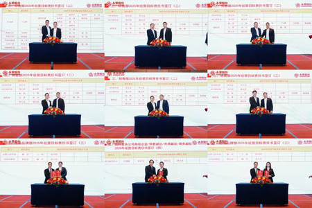 下午则进行了2025年营销各岗位经营目标责任书签订仪式,仪式现。兆囟纤啵饔嗽奔霸鹑稳艘来紊咸ǎV氐卦谠鹑问樯锨┫伦约旱拿帧U庖灰鞘奖曛咀殴 2025年营销工作的全面启动,也进一步强化了永荣营销铁军在复杂多变的市场环境中积极应对挑战、努力开拓创新,全力确保各项指标任务圆满完成的责任意识和坚定信念。