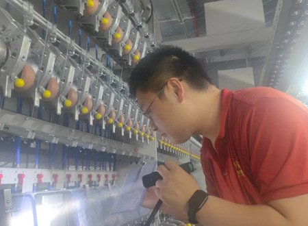 工作中,他秉持“不待扬鞭自奋蹄”的自驱精神,深入贯彻公司“客户至上,奋斗者尊”的核心理念。以强烈的责任感与使命感,他潜心钻研新设备机理与操作要领,洞悉产品质量关键与管控之道,持续创新操作流程,力求品质卓越。通过设备协同与流程优化,他将员工单区生头操作平均时长从17分钟锐减至13分半,效率跃升20.6%。结合锦逸项目进展与ATY产品特性探索,他提出利用空压机冷却水余热改造方案,年节电超50万元。2024年8月,锦逸ATY产品在喷水织机上打纬速度突破720/min,领跑业界。同年9月,国产ATY机产品规格亦成功拓展至33D。全年产量逾7000吨,实现零客诉,圆满超越预定产质量目标。