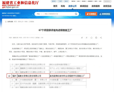 近日,福建省工业和信息化厅正式公布了“2025年先进级智能工厂项目名单”,福建永荣锦江股份有限公司高性能锦纶新材料全流程数字化智能工厂凭借其卓越的智能制造实力和显著的数字化转型成果,成功入选该名单。这一荣誉不仅是对永荣股份在智能制造领域深厚实力的认可,更是对公司作为推动制造业数字化转型与高质量发展标杆地位的肯定。