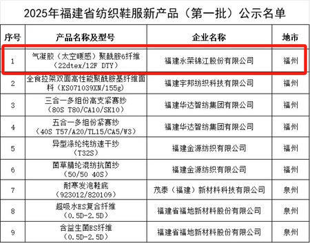 近日,福建省工业和信息化厅公布2025年纺织鞋服新产品征集结果,福建永荣锦江股份有限公司(以下简称“永荣股份”)自主研发的“气凝胶(太空暖感)聚酰胺6纤维(22dtex/12F DTY)”凭借突破性技术创新与卓越性能,从众多参评产品中脱颖而出,成功入选。标志着我司产品连续三年跻身该省级创新名录,彰显了其在功能性纤维领域的持续领跑实力。