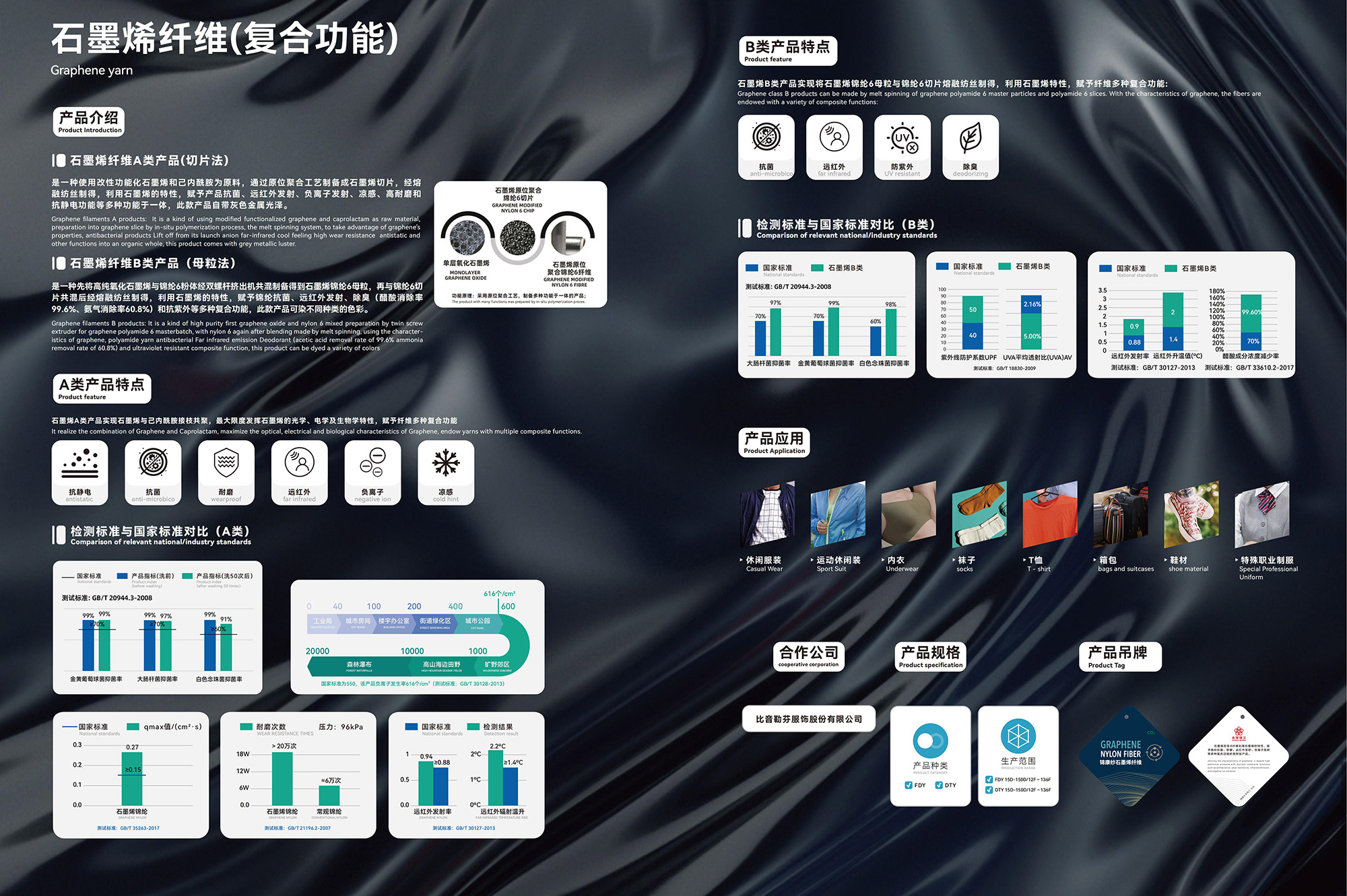 是一种使用改性功能化石墨烯和己内酰胺为原料,通过原位聚合工艺制备成石墨烯切片,经熔 融纺丝制得,利用石墨烯的特性,赋予产品抗菌、远红外发射、负离子发射、凉感、高耐磨和 抗静电功能等多种功能于一体,此款产品自带灰色金属光泽。