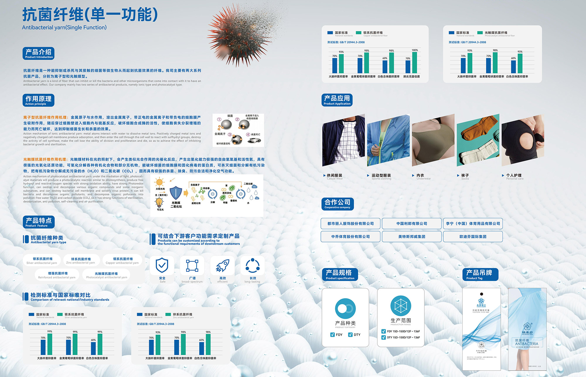 抗菌纤维是一种能抑制或杀死与其接触的细菌等微生物从而起到抗菌效果的纤维。我司主要有两大系列 抗菌产品,分别为离子型和光触媒型。