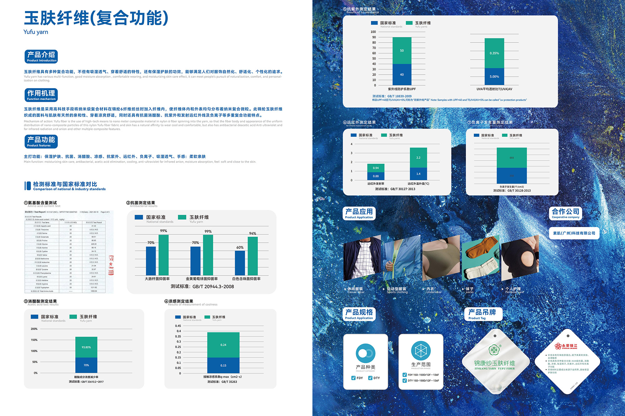 玉肤纤维具有多种复合功能,不但有吸湿透气、穿着舒适的特性,还有保湿护肤的功效,能够满足人们对服饰自然化、舒适化、个性化的追求。